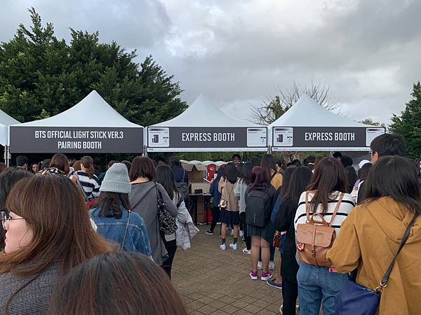 12/8的演唱會,12/3才買到票,好不容易臨時訂到飯店,早上到飯店寄放行李後,就趕緊搭機捷到桃園國際棒球場。到會場時才12:30,但是已經擠滿A.R.M.Y,前胸貼後背,超誇張。